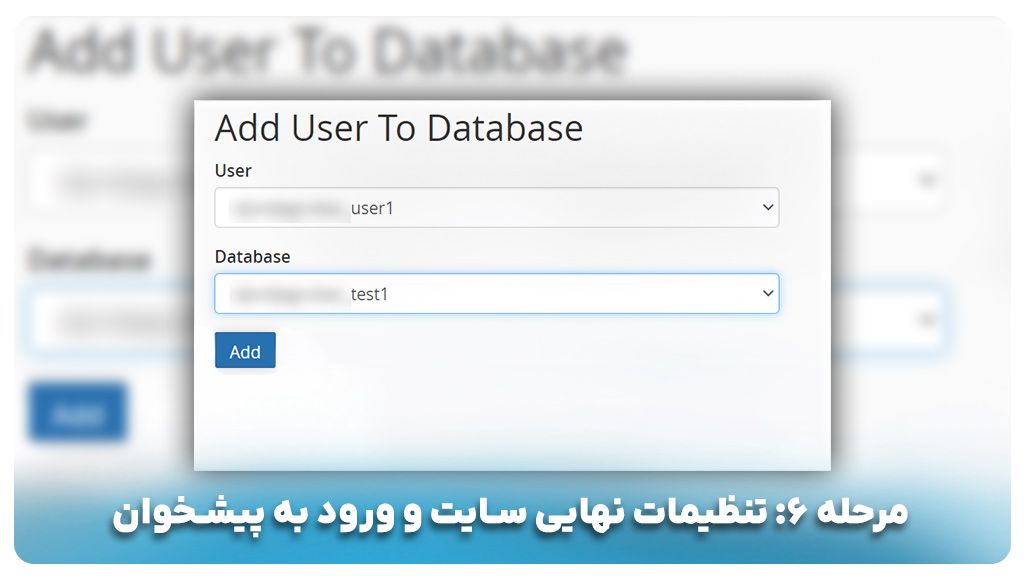 - حالا در قسمت Add User To Database کاربر ساختهشده را انتخاب کنید. سپس دیتابیس ساختهشده را انتخاب و روی Add بزنید.